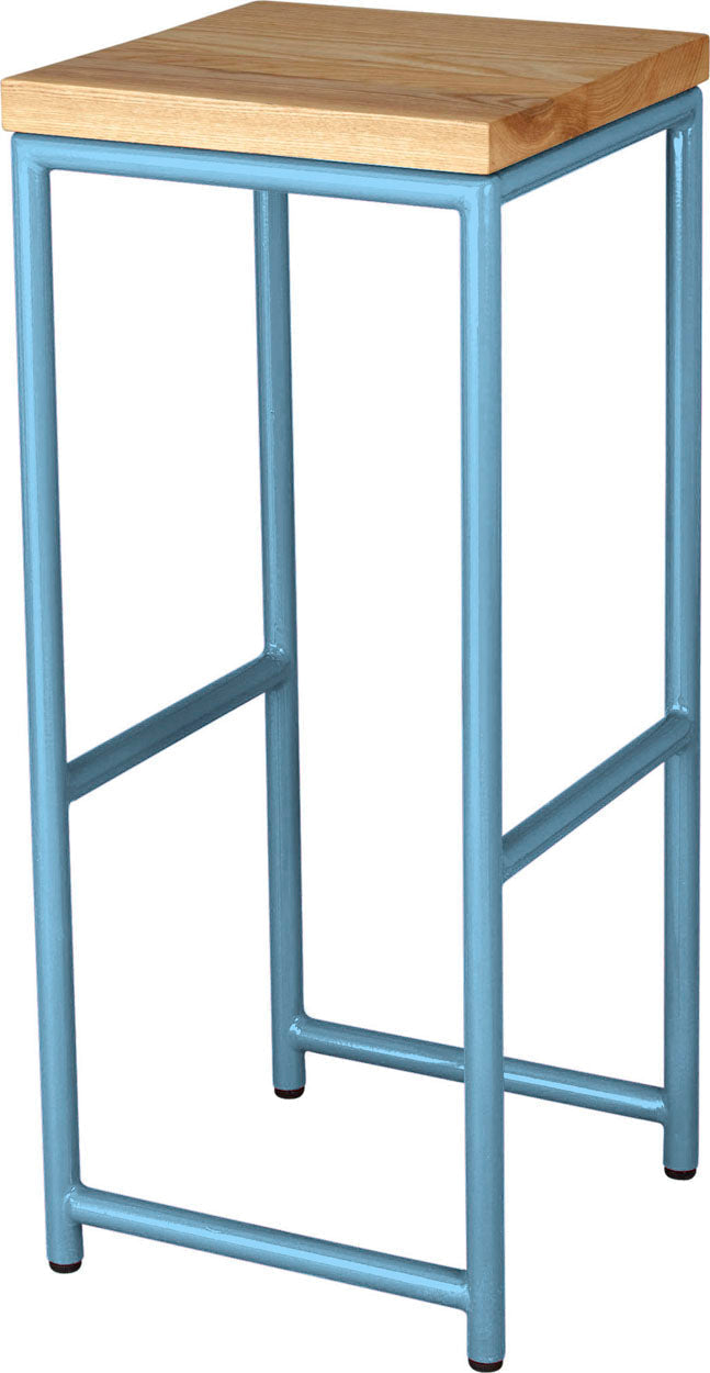 Duck-egg blue metal stool with natural stain ash wood made in UK - front view round frame