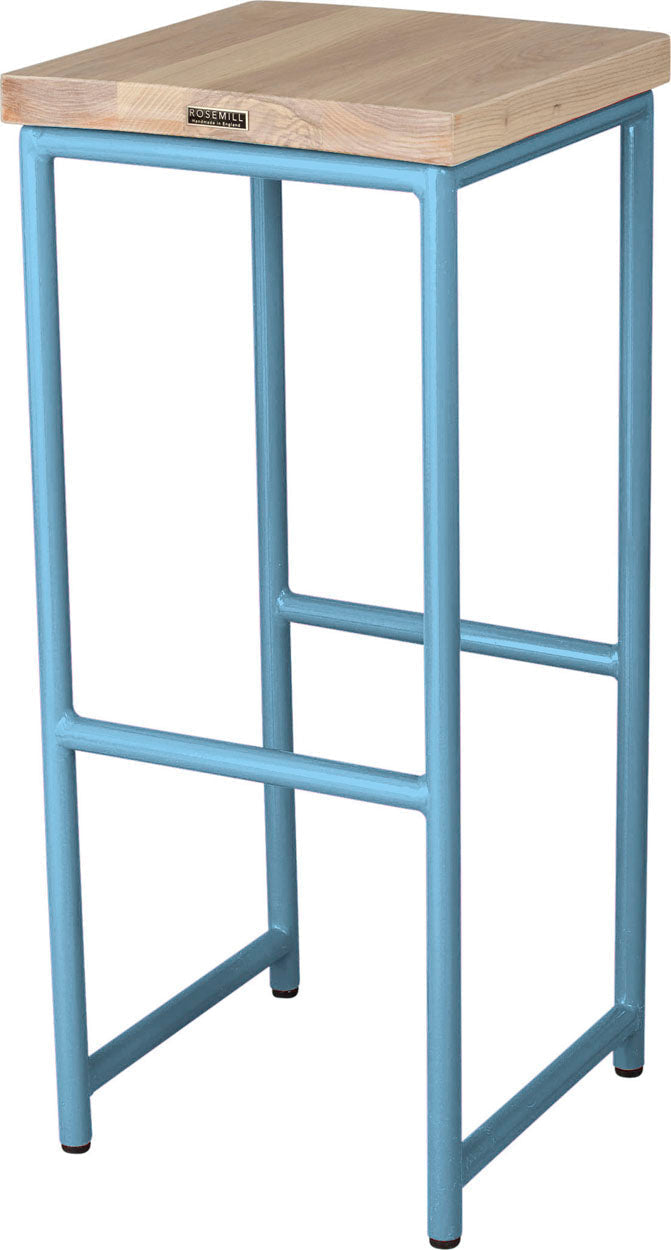 Duck-egg blue metal stool with natural stain ash wood made in UK - back side view round frame