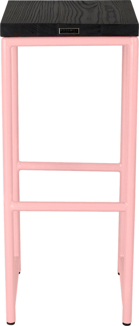 Pink metal stool with black stain ash wood made in UK - front view round frame