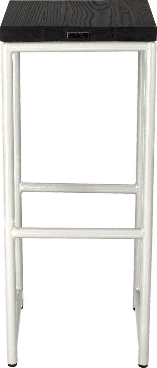 Gloss white metal stool with black stain ash wood made in UK - front view round frame