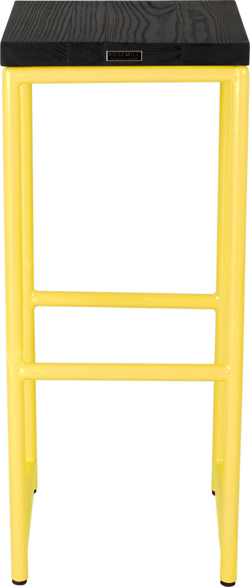 Gloss black metal stool with black stain ash wood made in UK - front view round frame