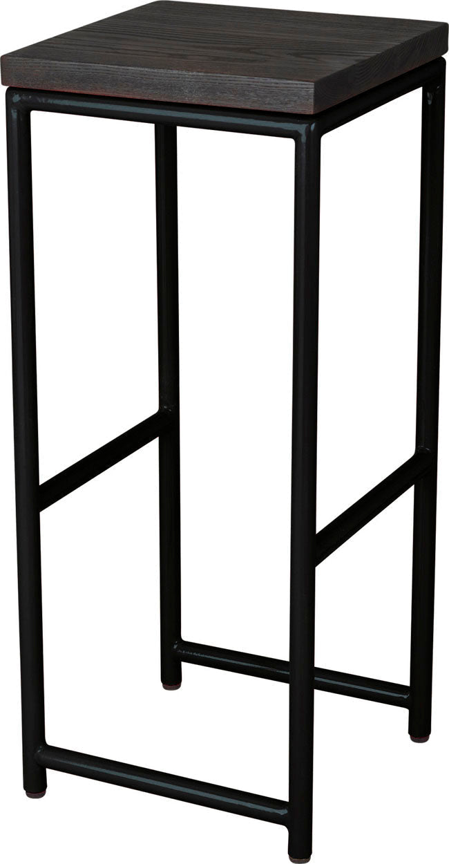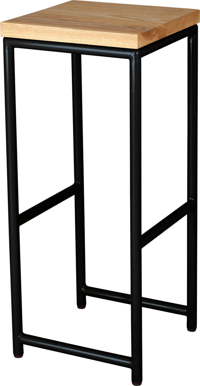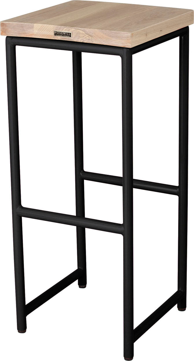 Gloss black metal stool with natural stain ash wood made in UK - side view round frame