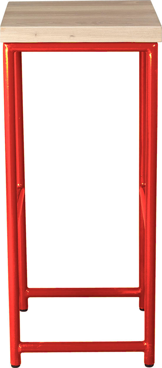 Crimson red metal stool with natural stain ash wood made in UK - front view round frame