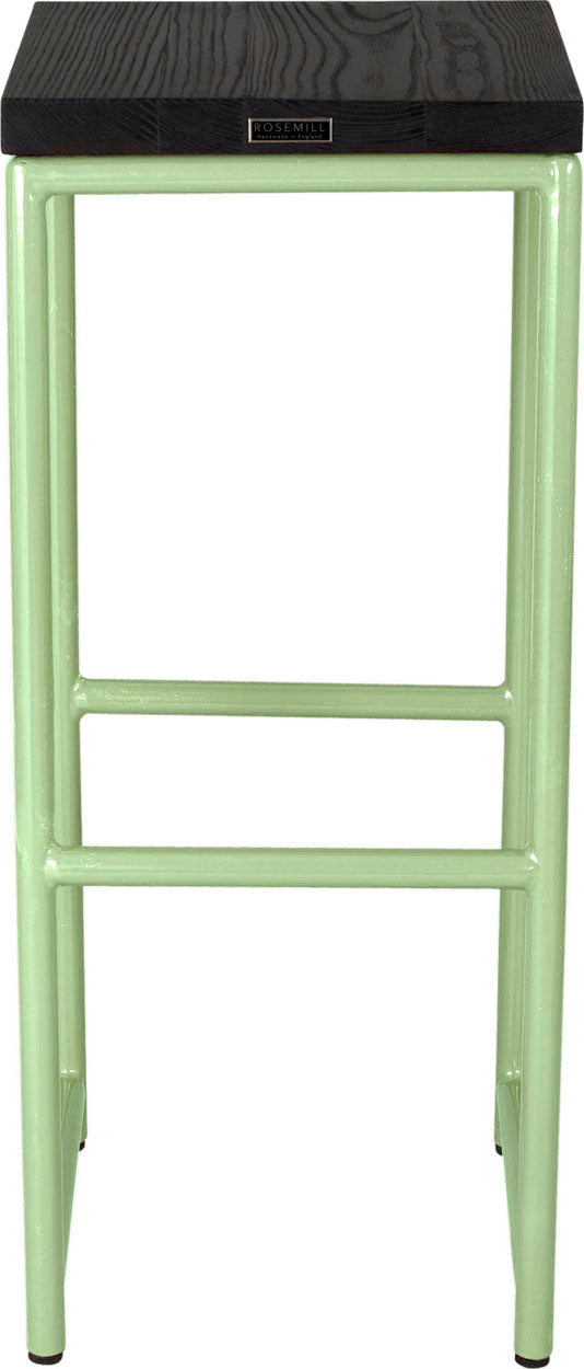Sage green metal stool with natural stain ash wood made in UK - back side view round frame
