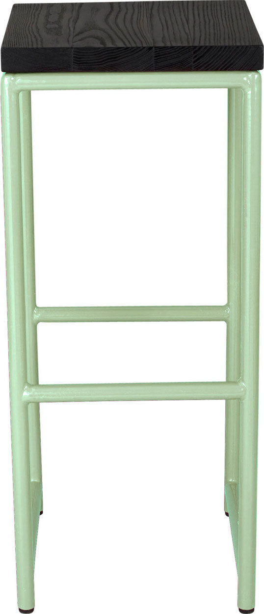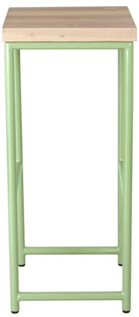 Sage green metal stool with natural stain ash wood made in UK - front view round frame