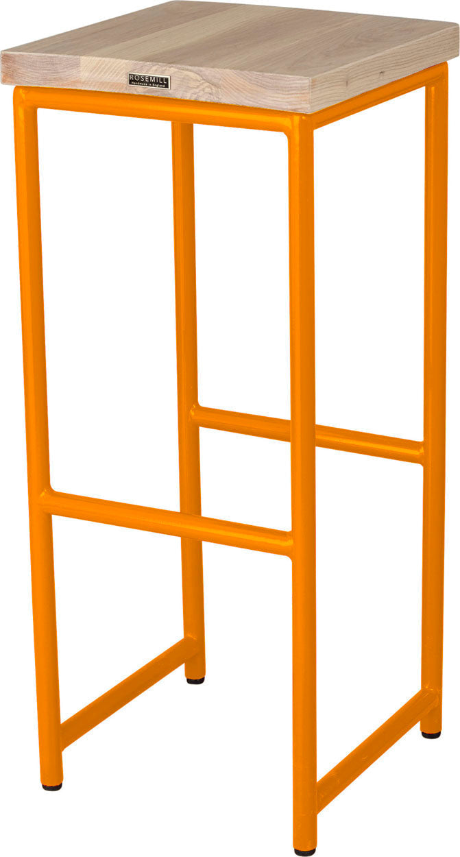• Load image into Gallery viewer, Orange metal stool with natural stain ash wood made in UK - front view round frame